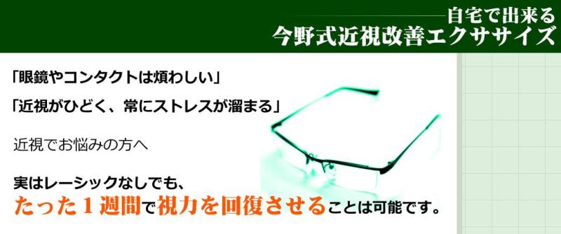 あなたの近視が改善するのには理由があります!この方法は現在までに3万人以上の方が実践し、更に88.8%の方が“その場で”視力が回復した事が証明されています!では、この人たちはいったいどうやって視力を回復させたのか…今から、その秘密を初公開します!自宅で出来る今野式近視改善エクササイズ